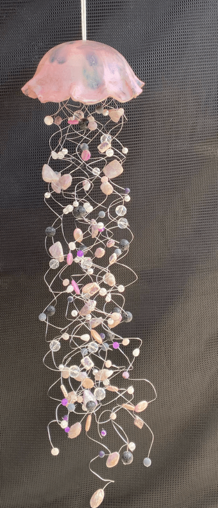 A copyrighted handcrafted artist rendition of a jellyfish. Jellyfish are the desired food of Leatherback turtles. Prices vary according to the “jewels” use. Tentacles may include Czech glass beads, crystals, and gemstones. This one is 31 inches long and 9 inches round with over 100 beads.